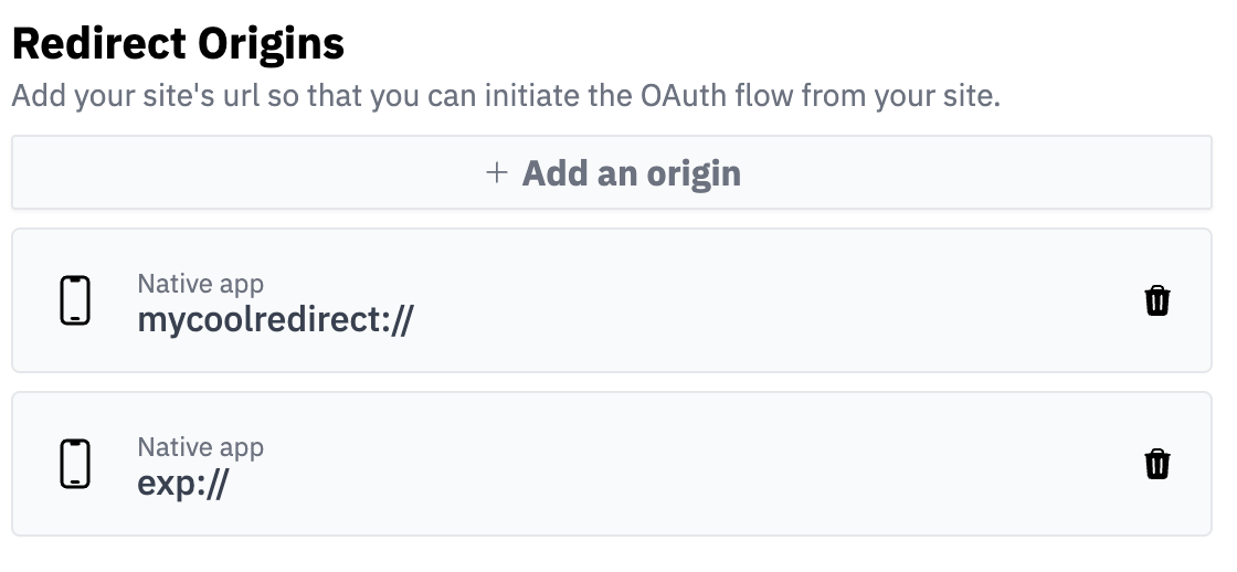 From the Auth tab on the Instant dashboard, add a redirect origin of type "App scheme". For development with expo add exp:// and your scheme, e.g. mycoolredirect://.