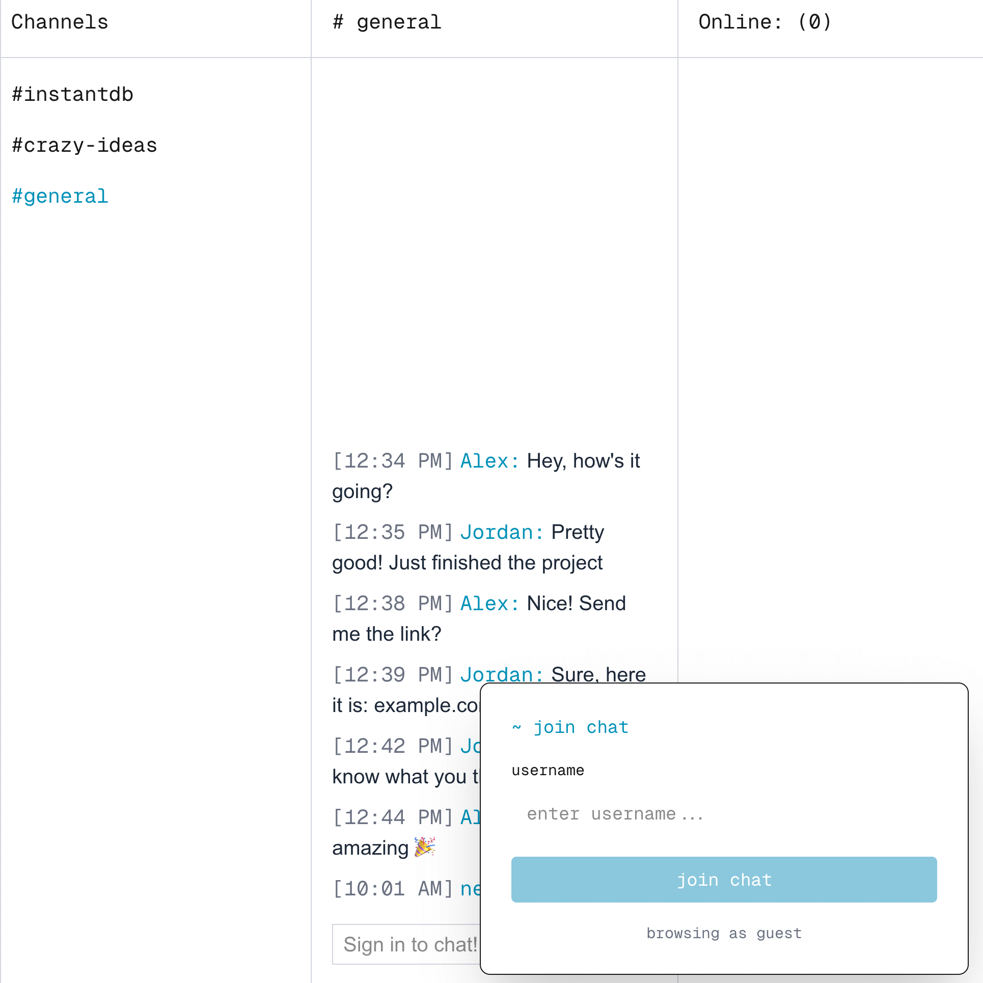 In this app we demonstrate how to use guest authentication to allow users to join without fully signing-up. Signed in users show up in the online list and can send messages to the chat.